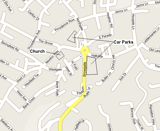 The larger car park in the centre is Ian Clough car park, which is off Hallcliffe – there are two entrances to this car park one on the right just after turning off the roundabout and the second one the next right just up the road before Ian Clough hall. The upper one leads to the top car park, which is connected to the bottom car park. The only exit is back onto Browgate at bottom of car park. There is also a small shoppers car park behind Martins newsagents (right turn after second left off roundabout). There is some on street car-parking on Westgate (first exit of roundabout), as well as along Newton Way, Springfield Road, and the Grove (See map below).